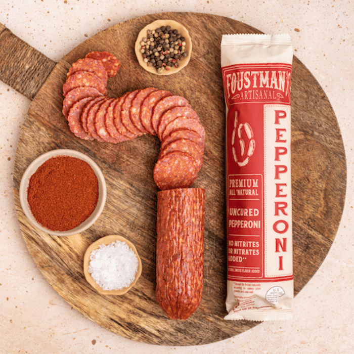 Foustman’s uncured pepperoni is made using a choice blend of pork and beef. Paprika gives our pepperoni its characteristic color and adds depth of flavor. This pepperoni isn’t just for pizza. Great for snacking on its own or try it in eggs or sauces.